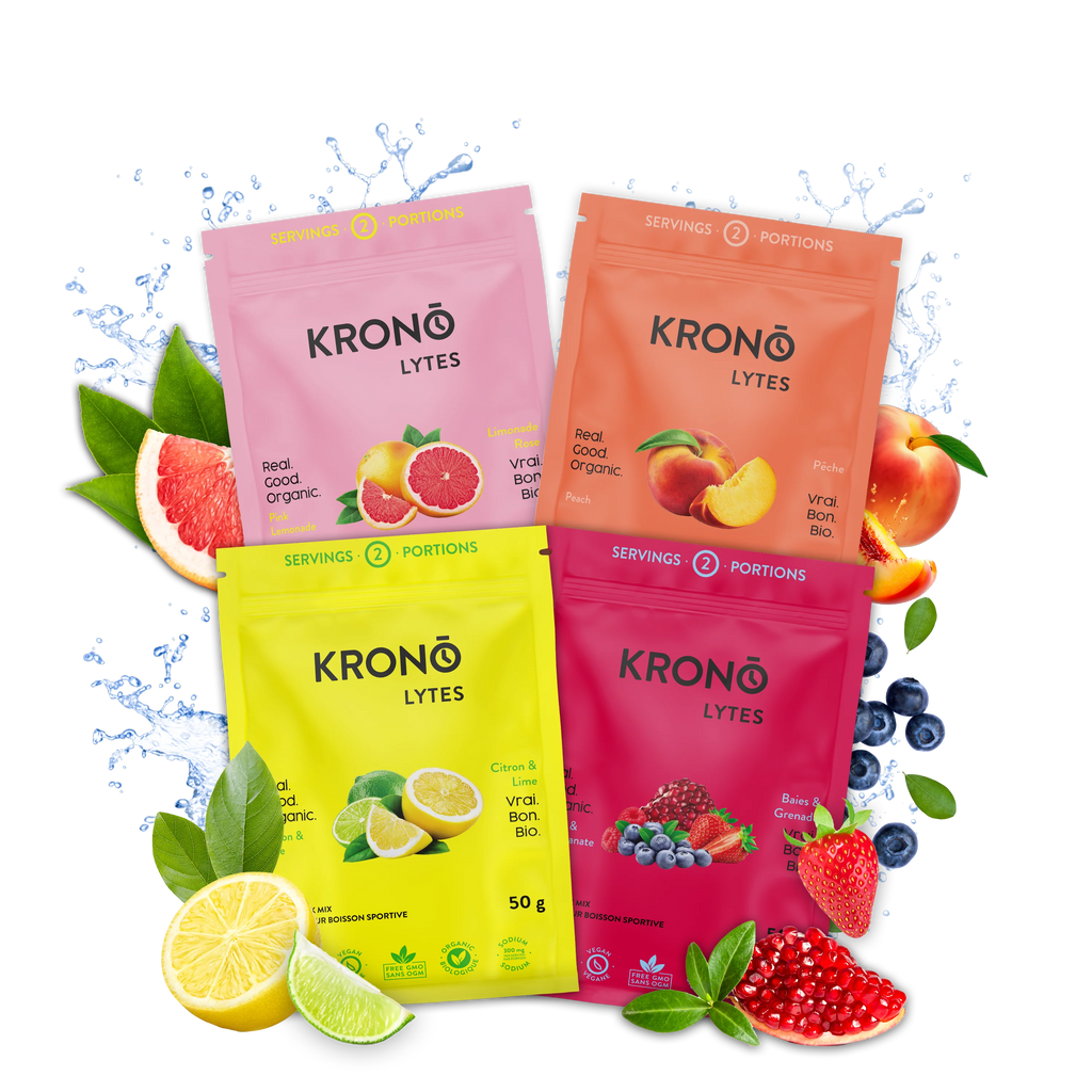 Krono Lytes, our electrolyte sports drink mixes, are essential for maintaining optimal hydration during your efforts. Naturally vegan and organic, they provide essential carbohydrates and sodium for perfect fluid and electrolyte balance. Simply add to water for a refreshing drink ready to support your sports and daily activities.